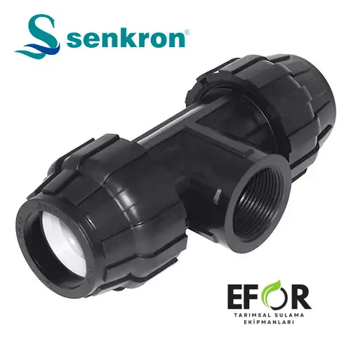 Kaplin Dişi TE, PE boru sistemlerinde hattı üç farklı yöne ayırmak ve aynı zamanda dişi dişli bir çıkış oluşturmak için kullanılan, yüksek dayanımlı bir T bağlantı parçasıdır. İki ucu boruya sıkıştırmalı şekilde takılırken, orta çıkış dişi dişlidir ve erkek dişli vana, musluk, filtre, rakor veya diğer ekipmanlarla tam uyum sağlar.